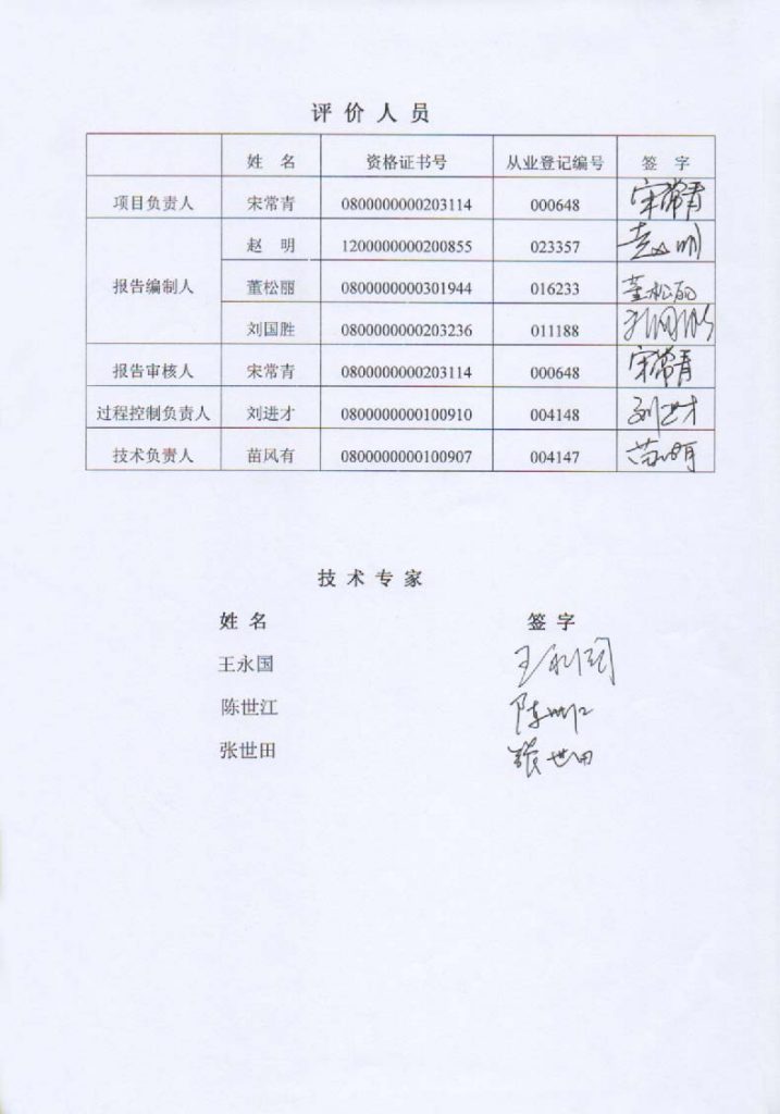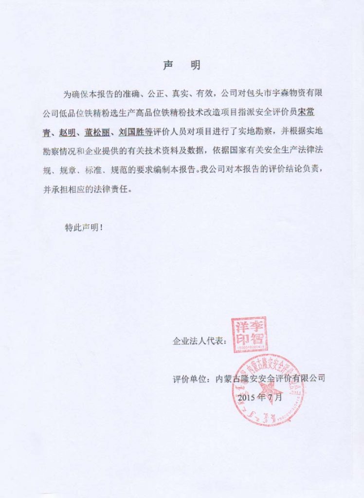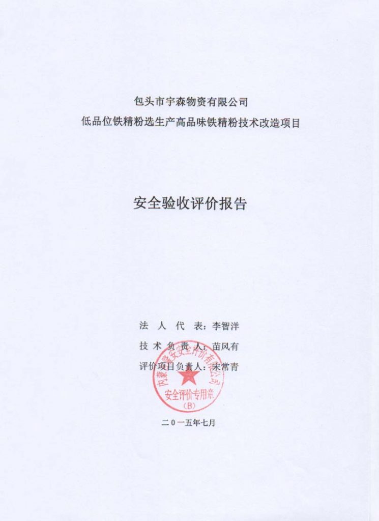 包頭市宇森物資有限公司低品位鐵粉精選生產(chǎn)高品位鐵精粉技術(shù)改造項(xiàng)目安全驗(yàn)收評(píng)價(jià)報(bào)告–簽字表