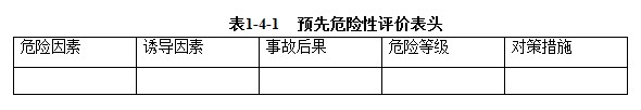 預先危險性分析的結果,一般采用表格的形式。表格的格式和內(nèi)容可根據(jù)實際情況確定。本評價采用的格式如下表1-4-1所示: