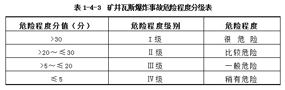 根據(jù)煤礦的實際狀況,通過專家評議對各因子進行取值,從而計算出瓦斯爆炸的危險度數(shù)值,然后按照此危險度數(shù)值對瓦斯爆炸的危險程度進行分級。分級標準如表1-4-3所示。